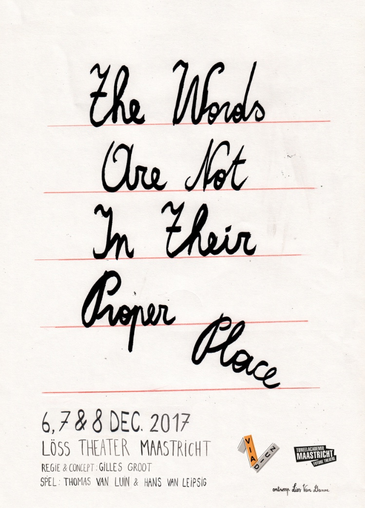 Afstudeervoorstelling Flynn, een beeldend kunstenaar, kan na een herseninfarct niet meer zeggen wat hij denkt. Hij heeft een zware vorm van afasie en zijn geheugen laat hem in de steek. Zijn herinneringen zijn een labyrint geworden. Telkens opnieuw ziet hij flarden voorbijkomen van zijn leven. Afwisselende beelden van kort en lang geleden. Hij ziet zichzelf, zijn zoon, zijn favoriete zanger Bryan Ferry en hoort de stem van iemand uit een ver verleden. Wie was hij eigenlijk? Heeft hij in zijn leven de juiste keuzes gemaakt? Waarom telkens die teleurstelling? En waarom vliegen er nu alleen nog maar zwarte wormen om hem heen? The Words Are Not In Their Proper Place is een voorstelling over de dingen die voorbijgaan, alleen nog maar terugkomen in gedachten, over afscheid nemen, nog een keer jong willen zijn en over de schoonheid van het leven. Credits Regie & concept : Gilles Groot Spel: Hans van Leipsig & Thomas van Luin Dramaturgie: Niels Nuijten Geluidsontwerp: Gilles Groot & Jelle Hoekstra Coaching: Christophe Aussems Poster ontwerp: Lies van Damme Coproducent: VIA ZUID Geïnspireerd op de spreekstukken Zelfbeschuldiging en Kaspar van Peter Handke Met dank aan: Het nieuwstedelijk, Toneelacademie Maastricht, Dennis Meyer, Tom Blokdijk & Rene Daniëls Te zien:- Löss Theater, Maastricht: december 2017
