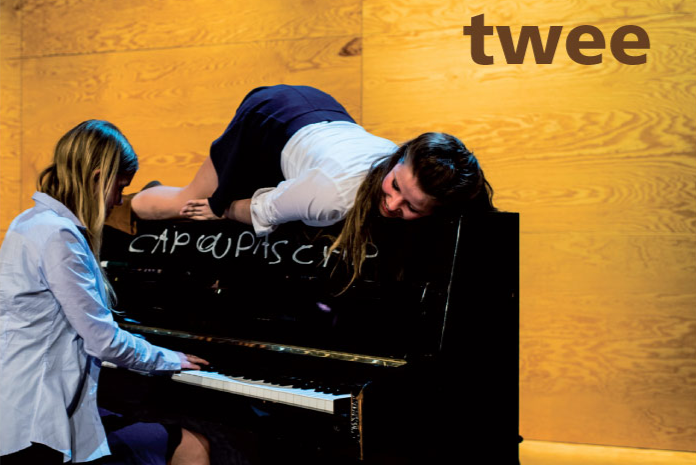 Twee gaat over een obsessieve vriendschap tussen twee pubermeisjes met een moord als gevolg. Juliet en Pauline, beste vriendinnen, delen op een grenzeloze manier liefde en fantasie en willen niet meer zonder elkaar. Liefde, een overweldigende emotie die rede en moraal doet vervagen in een uitzinnige wereld van samenzijn, staat centraal in de voorstelling. Het verhaal is gebaseerd op de waargebeurde Parker-Hulme moordzaak die zich afspeelde in 1954.